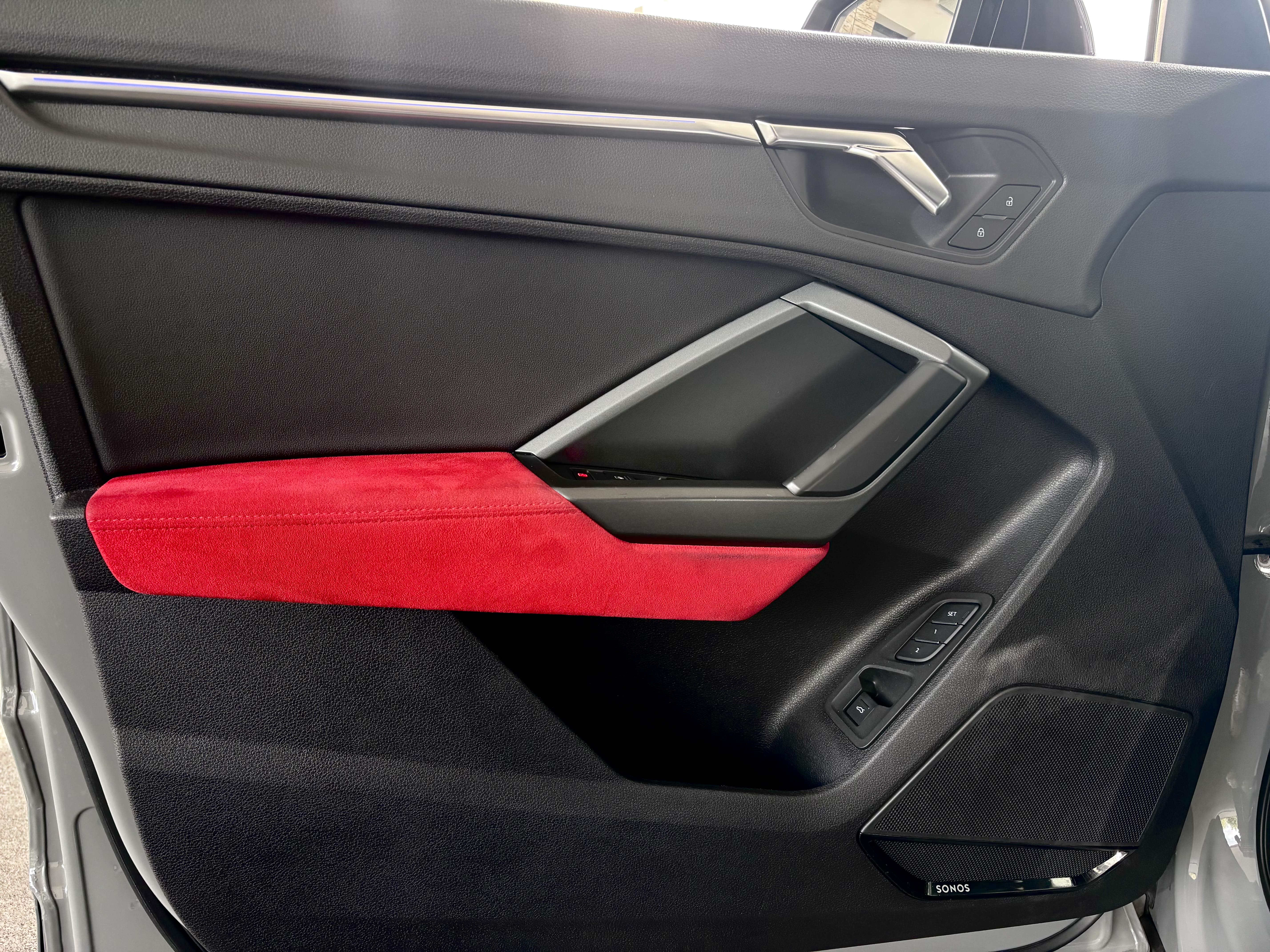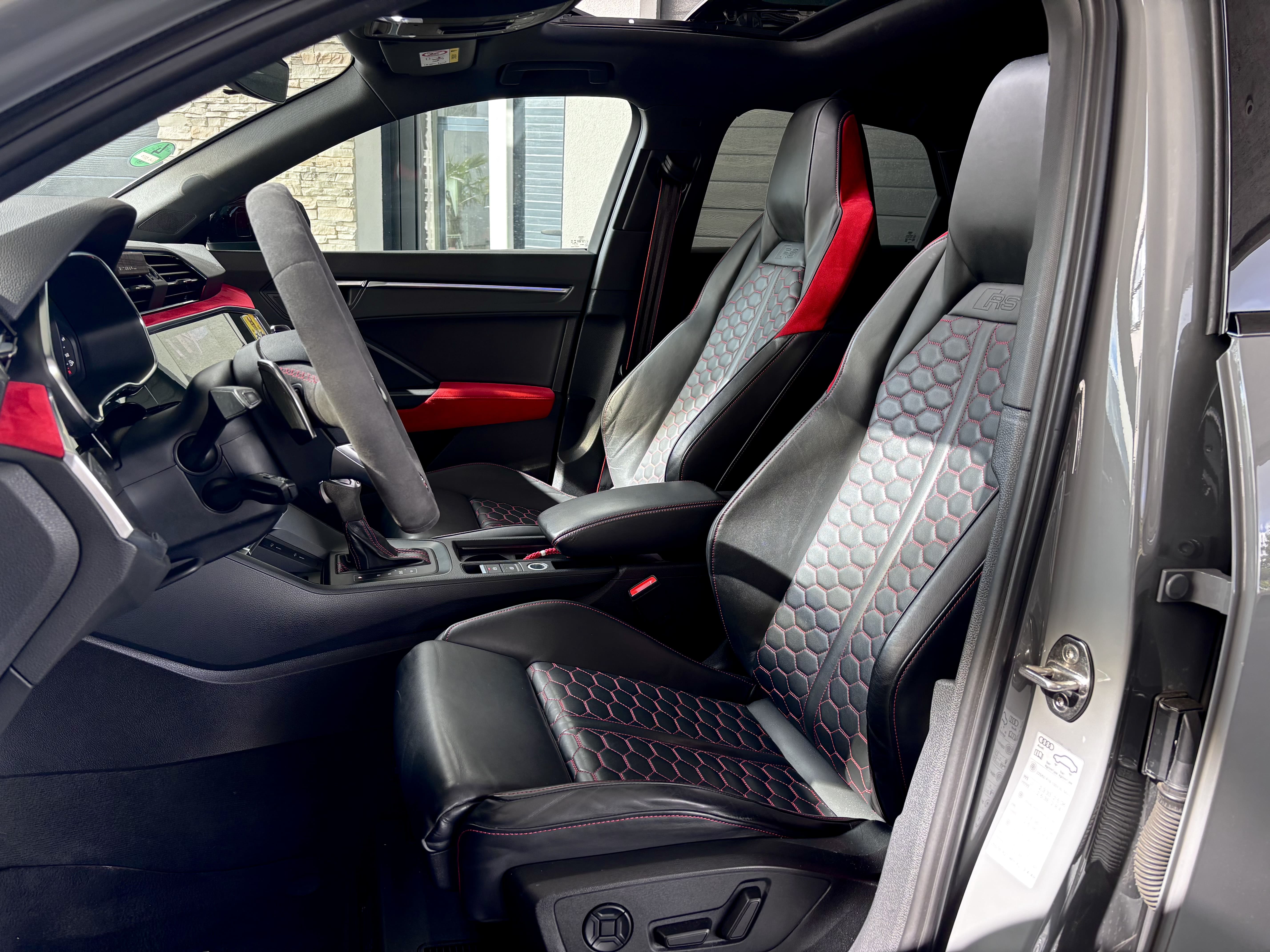 Dans cette configuration Gris Nardo, avec pack RS Design rouge, toit panoramique et éléments en carbone, ce modèle permet de profiter pleinement des vocalises de son moteur, ainsi que de son système audio Sonos.