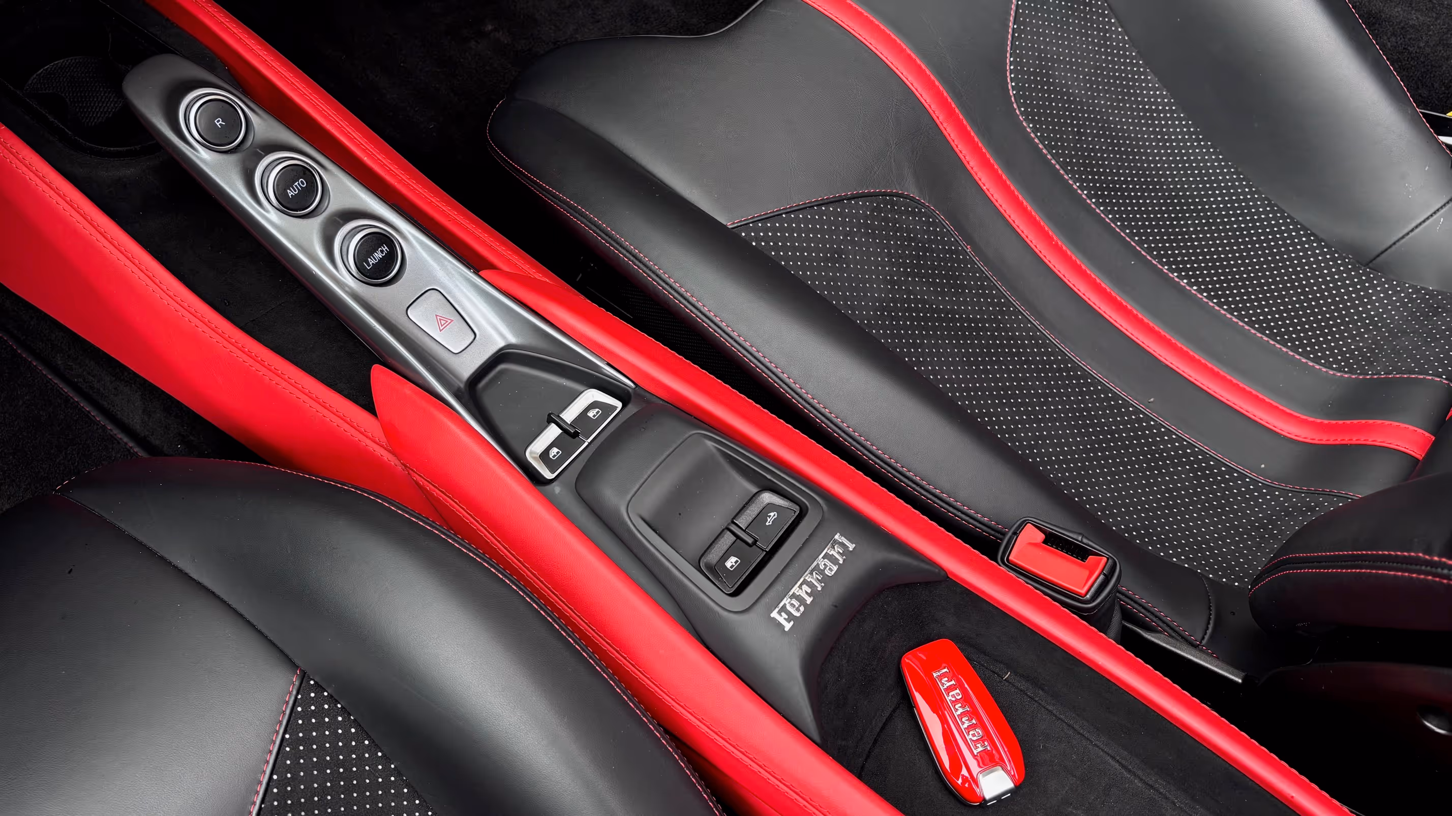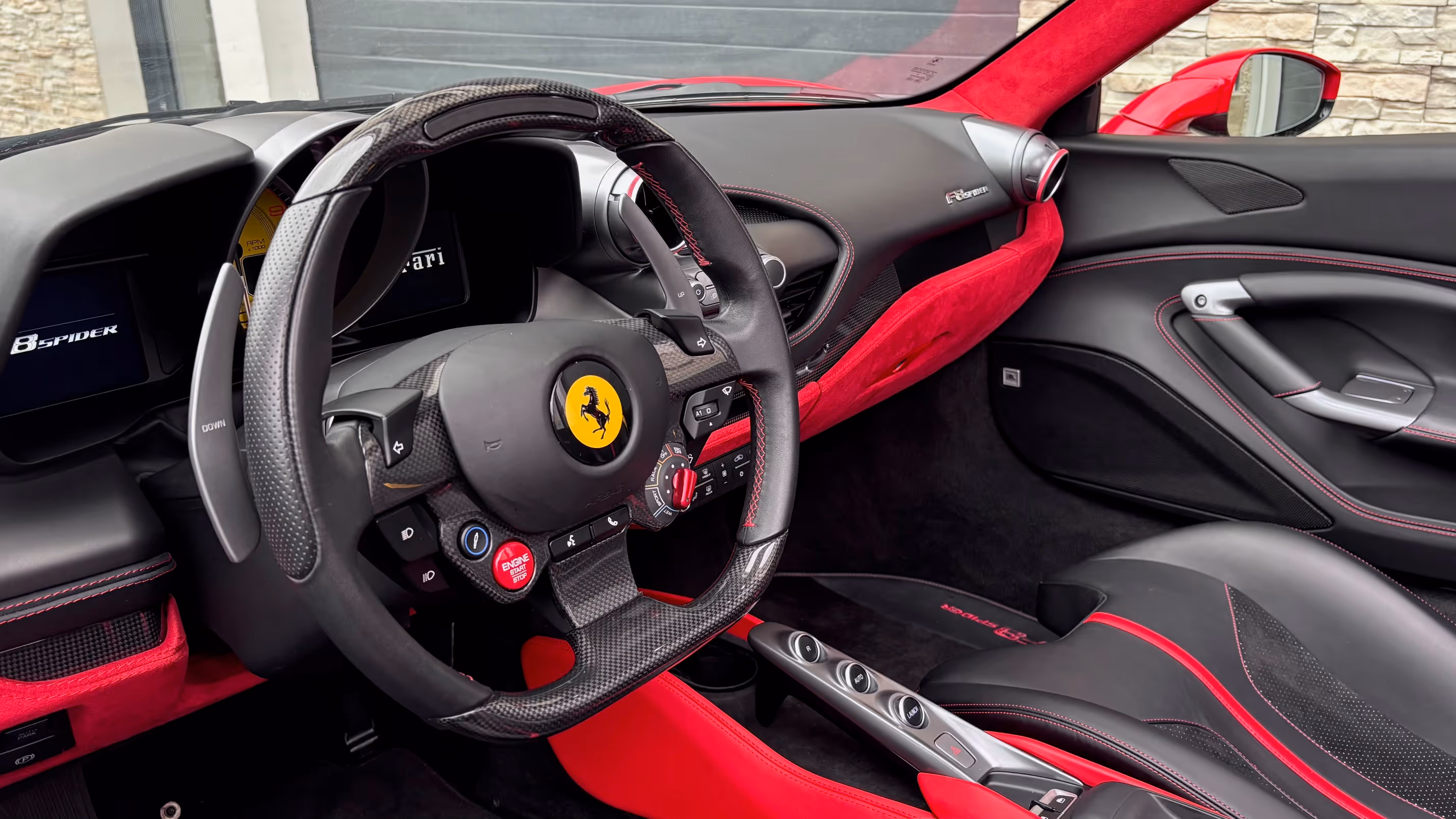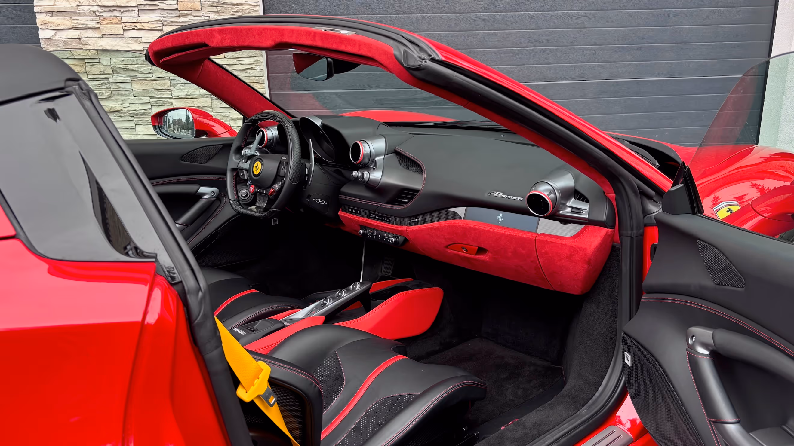 Dans cette configuration équipée d’un pack carbone, chaque détail souligne l’esprit sportif et l’esthétique raffinée qui font la légende de Ferrari.