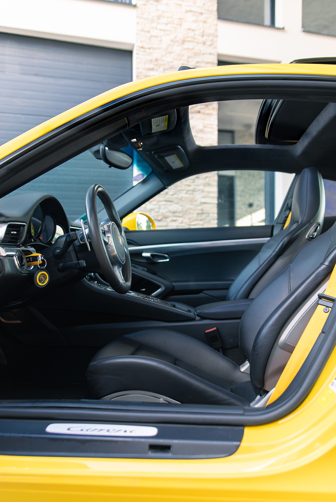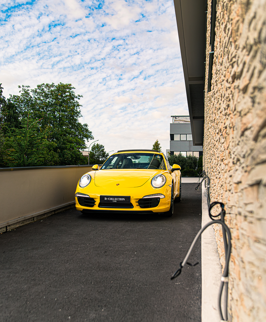 Porsche 911 Carrera 991.1 jaune, sportive iconique avec pack Chrono, échappement sport, toit ouvrant et 71 000 km. Élégance intemporelle et sensations authentiques.